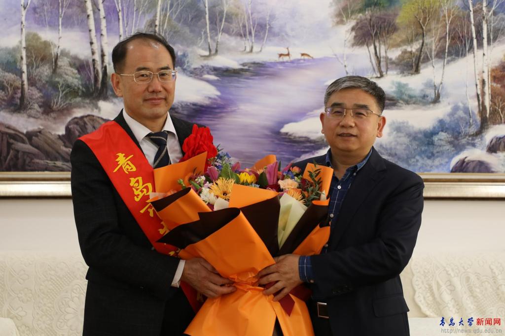新闻网讯 4月29日上午,校党委书记胡金焱在办公楼320接待室,会见了刚刚荣获“青岛市先进工作者”荣誉称号的纺织服装学院房宽峻教授。