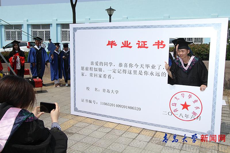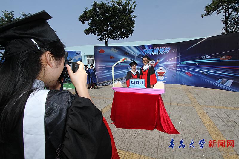 场馆外,学校搭建了“毕业小镇”,设置了“青青校园”“青大时光机”“我们毕业了”“镂空毕业证”“学在青大”等主题元素的简易背景墙,毕业生们纷纷在此合影留念。