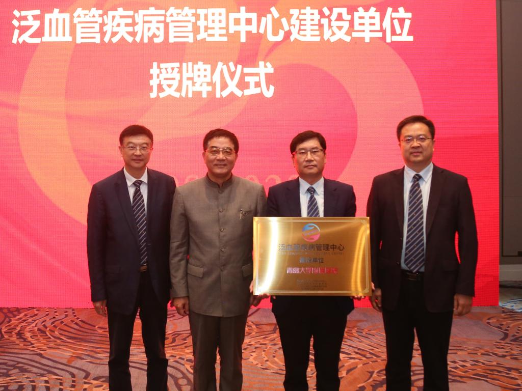 葛均波为青大附院泛血管疾病管理中心建设单位授牌。青大附院心血管内科主任廉哲勋作泛血管疾病管理中心建设工作汇报。