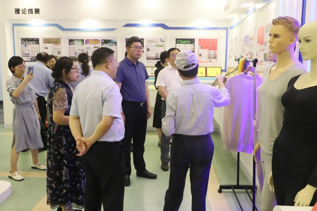 国家重点实验室主任夏延致向考察组讲解和展示了实验室近年来在生物成纤资源筛选与生物多糖制取、生物多糖纤维成形、生态功能纺织品创制等领域的研发成果。