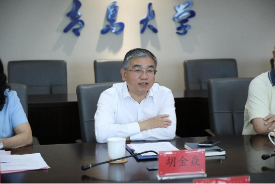 胡金焱在致辞中对车滨一行表示热烈的欢迎,并从位置好、政策好、平台好、待遇好等方面详细介绍了近年来学校事业发展情况。胡金焱肯定了德州学院办学特色鲜明、发展速度快,开创了高水平、有特色、国际化应用型大学建设新局面。他指出,两校优势互补、交流密切,希望以此次签署合作协议为新起点,加强互动、深化合作,互相成就、互相加持,携手共建从纺织学科到纺织产业的生态链,“东西合力”共同为促进山东省高等教育高质量发展、服务区域社会经济发展作出贡献。