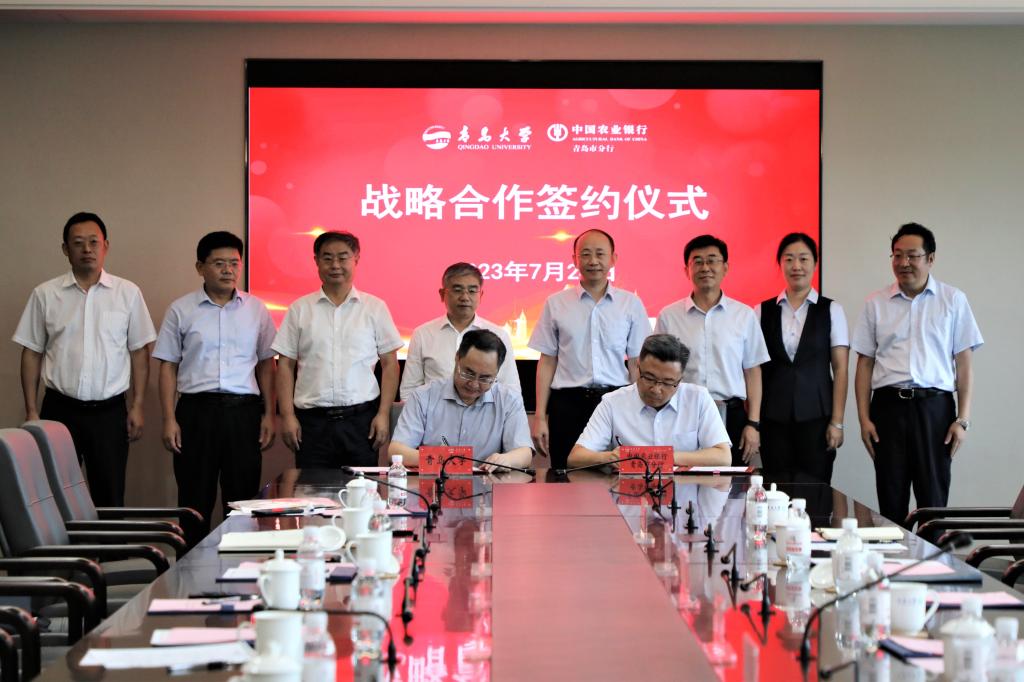 新闻网讯 7月24日上午,伟德官网与中国农业银行青岛市分行战略合作协议签署仪式在会议中心302会议室举行。中国农业银行青岛市分行党委书记、行长邵利洪,党委委员、副行长孙鹏,党委委员、纪委书记宋秀峰,校党委书记胡金焱,校长夏东伟,党委常委、副校长李军出席签约仪式。仪式由校合作发展处处长张燕主持。