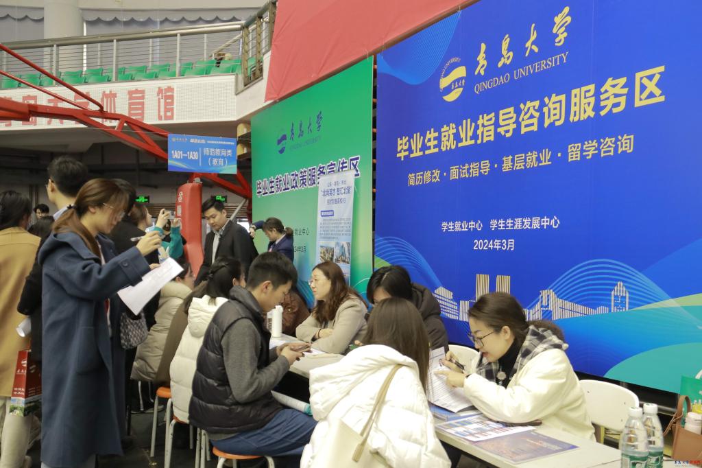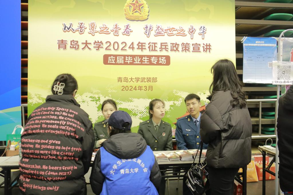 在双选会现场的独立区域设立了“三大就业赋能区”,包括政策服务宣传区、就业指导区以及征兵入伍宣传区,邀请青岛市人社局工作人员、校内引航生涯发展咨询室咨询师、青核先锋营政策宣传员等专业人士为毕业生提供相关领域的咨询服务。