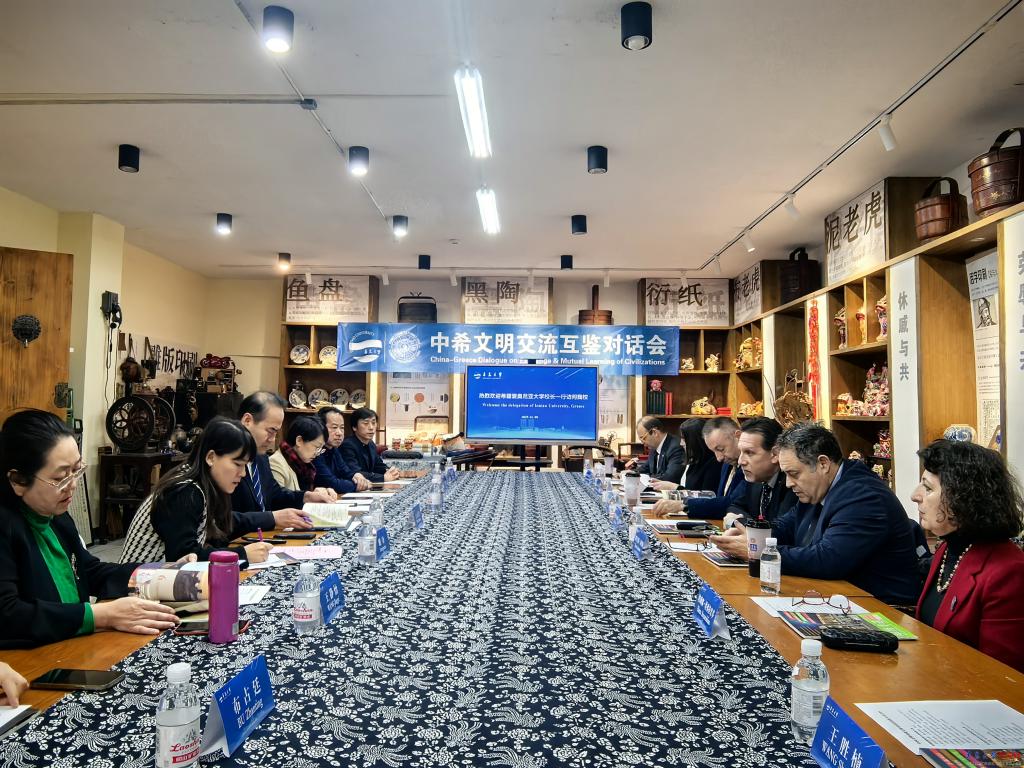 随后,双方在bevictor伟德官网民间工艺美学馆举办了“中希文明交流互鉴对话会”,对话会由国际交流合作处处长汪运波主持,外语学院、艺术学院、国际教育学院主要负责人及相关教师参加。双方就翻译及艺术领域的人才培养、文化传承、文化融合等进行了深入交流。