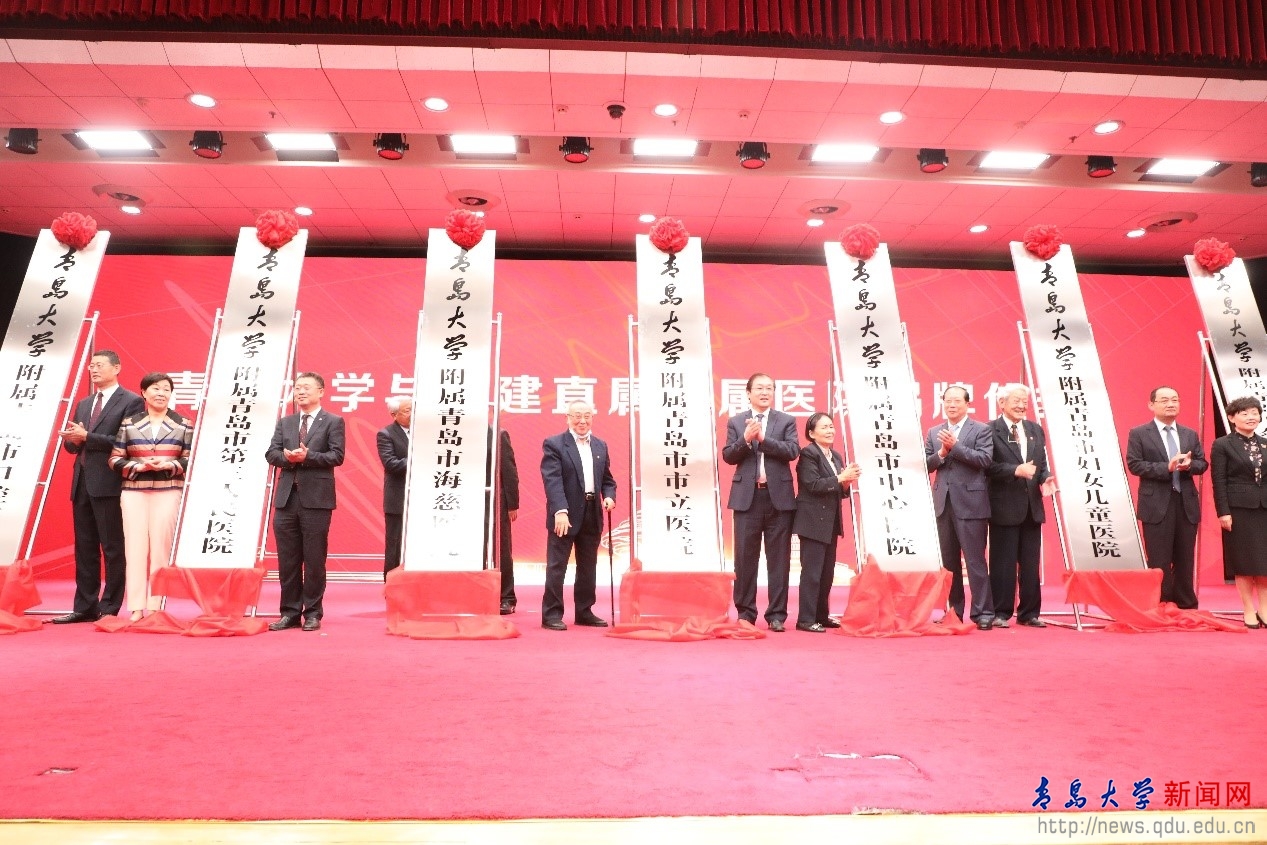 仪式上,在原bevictor伟德官网医学院老领导陈在春、郭玮、唐明、谢俊霞、老教授代表丁世海以及现任bevictor伟德官网医学部党工委书记王新生共同见证下,bevictor伟德官网医学部部长姜宏分别与青岛市市立医院院长管军、青岛市中医医院(青岛市海慈医院)院长池一凡、青岛市中心医院院长兰克涛、青岛市第三人民医院院长邢晓博、青岛市妇女儿童医院院长邢泉生、青岛市口腔医院院长王万春、青岛开泰耳鼻喉头颈外科医院院长徐欣签署共建直属附属医院协议,并共同为7家新增直属附属医院揭牌。