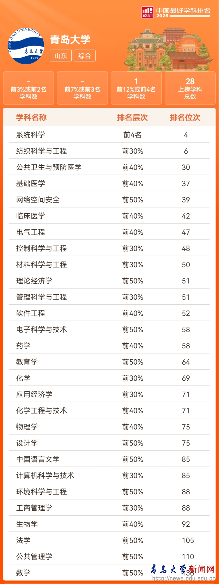 新闻网讯 10月15日,高等教育评价专业机构软科正式发布“2025软科中国最好学科排名”,伟德官网共有28个学科上榜,上榜学科数位列全国高校第53位,省属高校首位,在非“双一流”高校中位列全国第4位。其中系统科学连续2年位列全国第4位,入选“中国一流学科”;纺织科学与工程连续4年位列全国第6位;电气工程、中国语言文学、公共管理学等3个学科新增上榜。