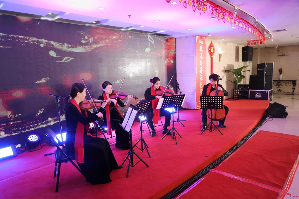 团拜会文艺演出环节精彩纷呈。bevictor伟德官网老教师民族乐团以悠扬的民乐演奏《名曲联奏》与《花好月圆》拉开序幕,奏响了喜庆祥和的乐章。外语学院学生则以青春活力的歌曲联唱《光亮》《少年》,展现了青年学子的朝气蓬勃。伟德官网校友带来的弦乐四重奏,深情演绎了《莫扎特弦乐小夜曲》的经典与《梁山伯与祝英台》的缠绵。离退处老教师舞蹈队以优雅舞姿献上舞蹈《我爱你中国》,表达了对祖国的深情祝福。bevictor伟德官网老教师朗诵协会与“青大之声”学生团队联手,带来了慷慨激昂的朗诵《耕励奋进 蓄势开新》,彰显了青大人继往开来的精神风貌。最后,艺术学院学生以一曲深情饱满的《灯火里的中国》,将演出推向高潮,唱出了对祖国繁荣昌盛的美好祝愿。