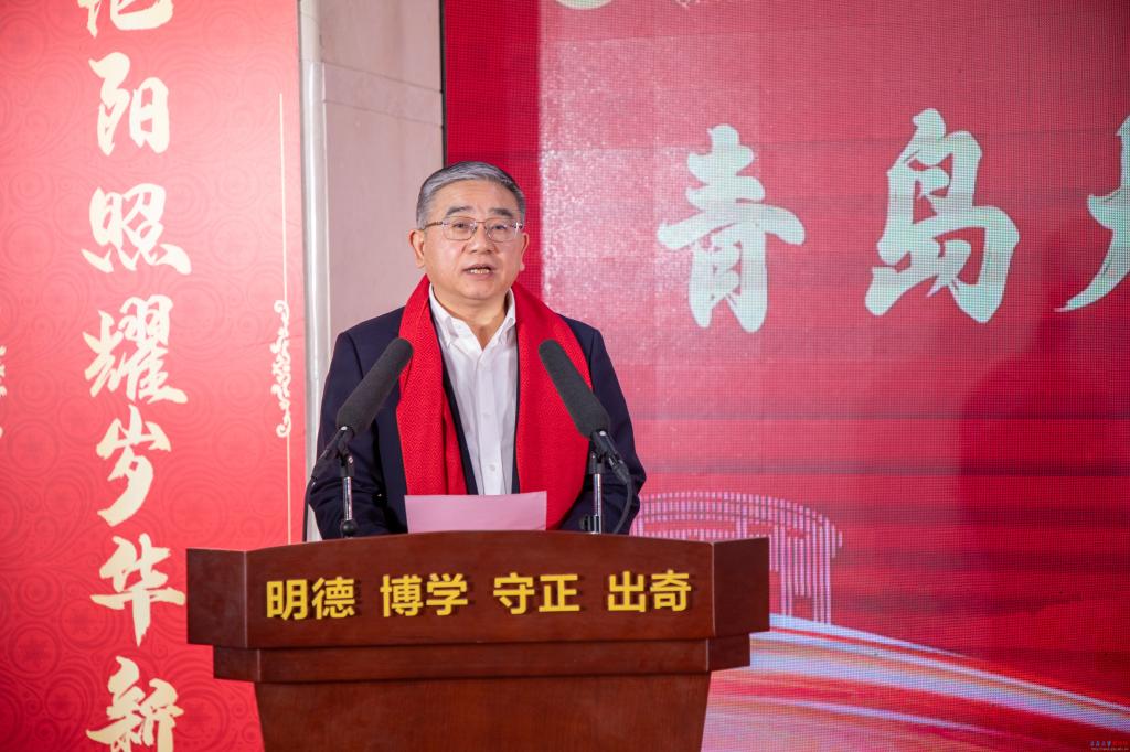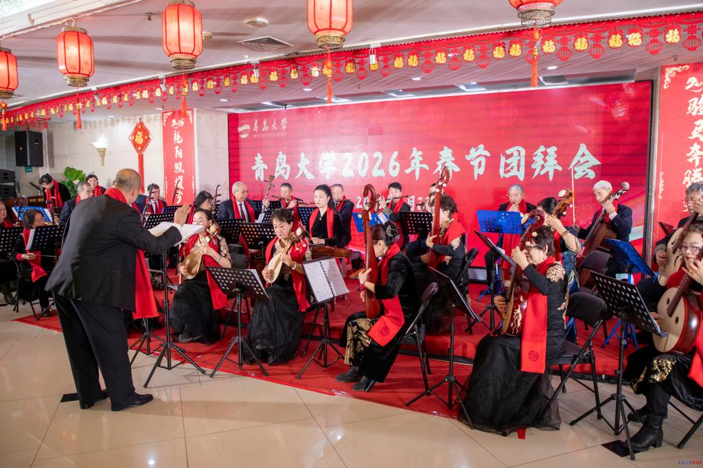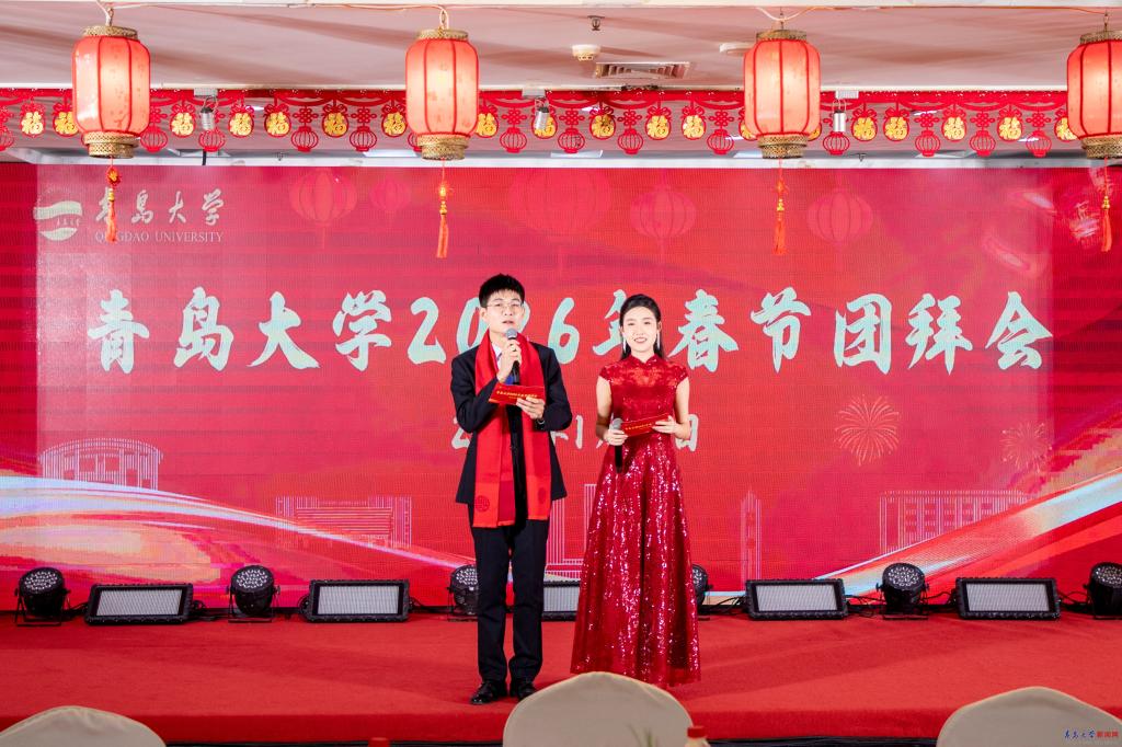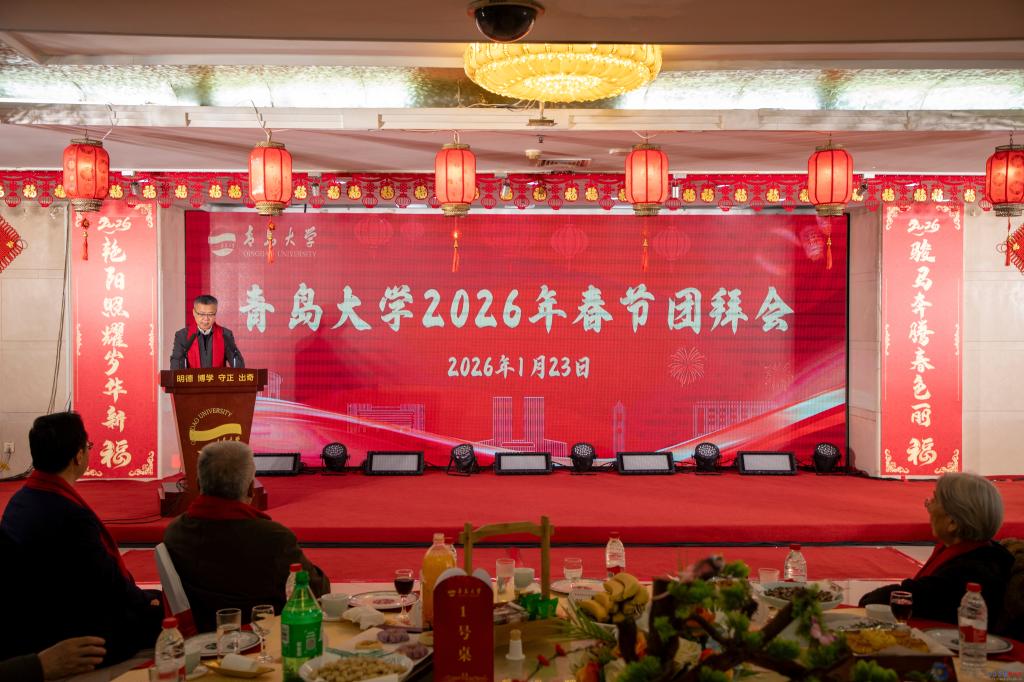 团拜会上,校党委书记胡金焱发表热情洋溢的新春致辞。他指出,2025年是学校“十四五”规划的收官之年。五年来,学校始终锚定高水平综合性研究型大学建设目标,聚力转型发展、创新发展、突破发展,推动各项事业取得历史性成就,综合实力实现跨越式提升。他系统回顾了学校在学科建设、人才培养、科技创新、校地融合、国际交流合作及资源获取等领域取得的标志性发展成果。胡金焱强调,这些成绩的取得凝聚着每一位青大人的智慧与汗水,他代表学校向辛勤奉献在教学、科研、管理、医疗和服务保障一线的全体教职医务员工,向奋发向上的莘莘学子,向情系母校的海内外校友,致以最诚挚的节日问候和最美好的新春祝愿。2026年是“十五五”规划的开局之年,也是全面落实教育强国建设三年行动计划的关键之年。他号召全校上下坚定信心、脚踏实地,以更加昂扬的斗志和扎实的行动,共同谱写高水平综合性研究型大学建设的新篇章。