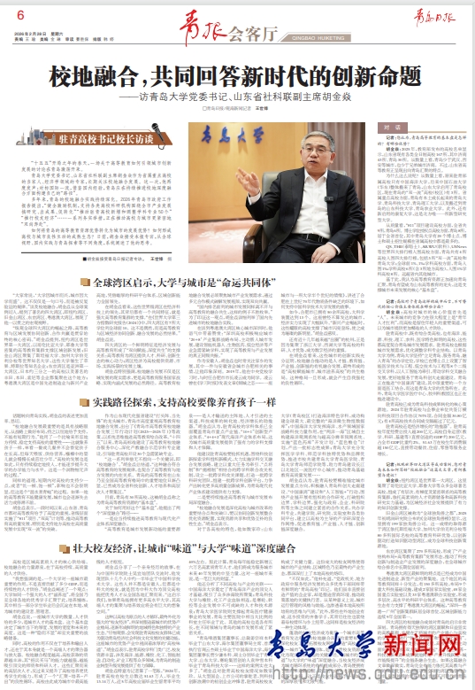 新闻网讯 2月28日,《青岛日报》刊登伟德官网党委书记胡金焱专访文章《校地融合,共同回答新时代的创新命题》,就如何将青岛的高等教育资源优势转化为城市的发展优势、如何形成高校与城市良性互动的成熟生态等问题,胡金焱进行了深入阐述。