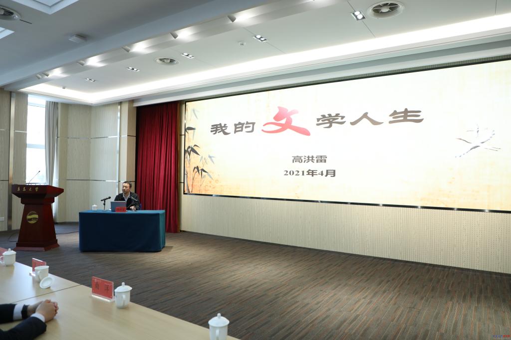 高洪雷先生“我的文学人生”为题讲述了爱上阅读,大量阅读中外经典作品是学习写作的基础;以自身写作历程为例,讲述如何一步步提升对于文学语言的驾驭能力,跨过文笔关;以自己创作《另一半中国史》《大话西域》等为例,讲述创作动机如何督促他以恒心完成皇皇巨著。高洪雷先生指导同学们在创作之初要做好选题筹划,可以按照唯一性、爱与人生、微观文学、赋予宏大背景等标准进行创作;要特别重视书名对于创作的重要作用,以代表作《另一半中国史》为例,展示书名如何有助于这本著作的营销和传播;文稿写成之后,需要经过反复修改和打磨才能成就创作。