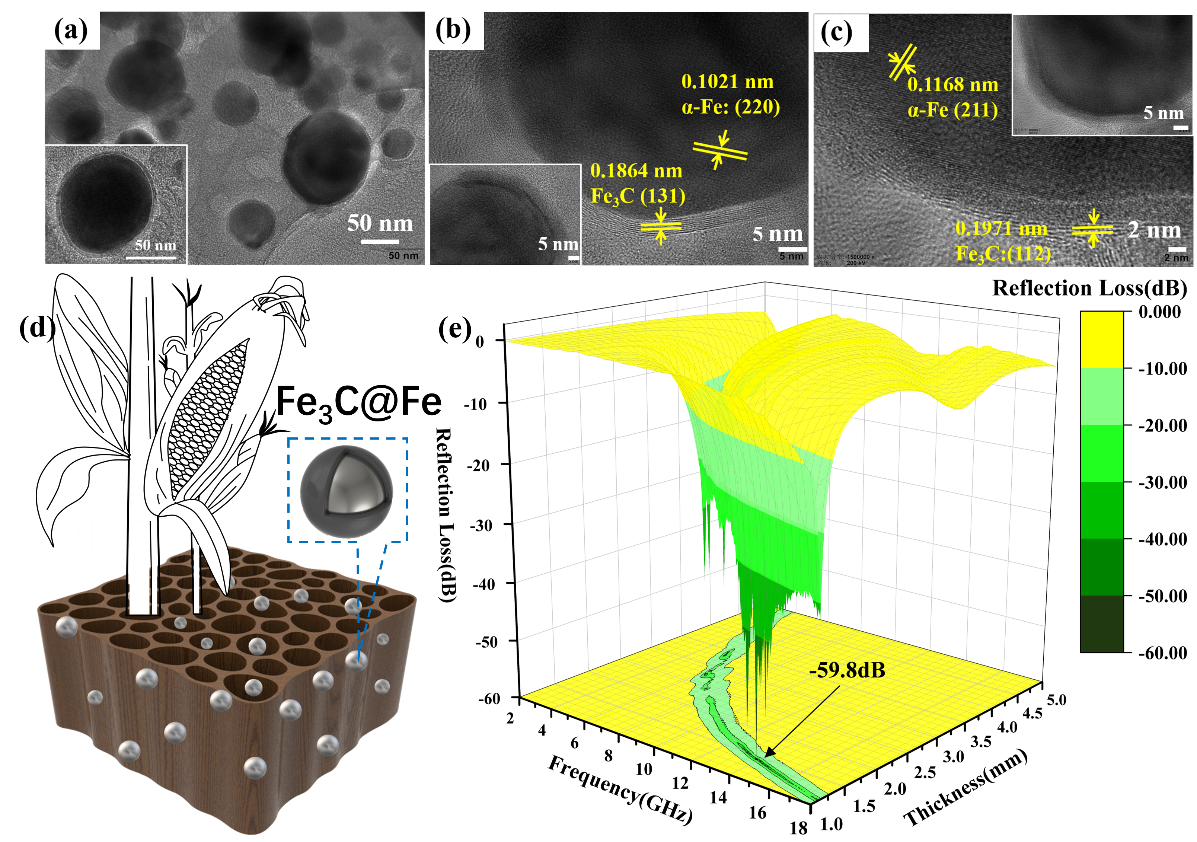 各种电子设备的应用在给人们生活带来方便的同时也带来了大量的电磁污染,影响人们的健康和信息安全,应对电磁污染的有效手段是发展电磁波吸收材料。但现阶段许多电磁波吸收材料存在吸收带宽窄、制备工艺复杂等问题。本项研究以常见的玉米秸秆为原料,利用秸秆天然的多孔结构通过简单的生物质转化法制得超轻的Fe3C@Fe/C纳米吸波材料,在超薄的厚度(1.13 mm)下即可实现优异的吸波性能(RL = -59.8 dB),其有效吸收带宽可达5.1 GHz。此工作还可以提高农业废料的利用效率,减少秸秆焚烧带来的环境污染。