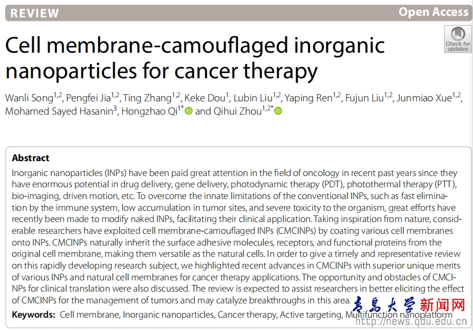 新闻网讯 近日,口腔医学院/转化医学研究院联合培养2019级本科生宋万里作为第一作者在期刊Journal of nanobiotechnology(IF2020: 10.435,中科院大类一区,Top期刊)发表综述论文“Cell membrane-camouflaged inorganic nanoparticles for cancer therapy”,指导老师和论文通讯作者为周祺惠特聘教授和亓洪昭助理教授,bevictor伟德官网为第一单位和通讯单位。