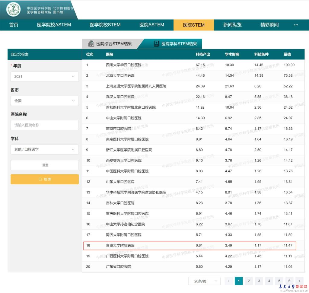 新闻网讯 8月4日,中国医学科学院发布了“2021年度中国医院科技量值(STEM)暨五年总科技量值(ASTEM)”,bevictor伟德官网口腔医学院(bevictor伟德官网附属医院口腔医学)位列全国第18位。