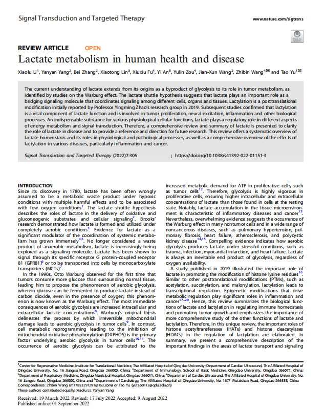 新闻网讯 近日,bevictor伟德官网医学部转化医学研究院于涛教授团队在《信号传导与靶向治疗》(Signal Transduction and Targeted Therapy)(IF:38.104,中科院一区,Top期刊)上发表了题为“Lactate metabolism in human health and disease”的长篇综述文章,bevictor伟德官网医学部博士生李晓璐为该文章的第一作者,副教授杨艳艳为共同第一作者,转化医学研究院于涛教授和青大附院超声科王志斌教授为通讯作者。