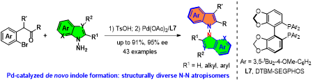 轴手性是手性的一种特殊形式,由于空间位阻和电子效应导致共价键不能自由旋转而产生。近年来,轴手性在不对称催化、天然产物、药物开发以及新材料合成中得到越来越广泛的应用。N-N轴手性作为轴手性家族中重要的一员,同样广泛存在于众多的天然产物以及药物活性分子中。然而,自1931年N-N轴手性发现以来,其不对称构建一直是一个巨大的挑战。近日,bevictor伟德官网刘人荣教授课题组继2021年在国际上首次实现N-N轴手性不对称合成后(J. Am. Chem. Soc.2021,143, 15005),通过钯催化从头构建吲哚策略首次实现了N-N联吲哚轴手性化合物的不对称合成。该研究工作得到了山东省泰山学者青年专家项目和bevictor伟德官网启动资金的资助。