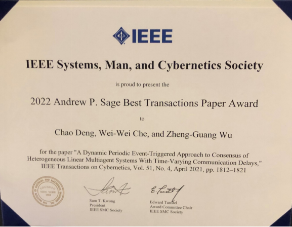 新闻网讯 近日,在捷克共和国布拉格举办的IEEE Systems, Man, and Cybernetics Society年会(IEEE SMC 2022)国际会议上,伟德官网自动化学院车伟伟教授团队发表的论文“A Dynamic Periodic Event-Triggered Approach to Consensus of Heterogeneous Linear Multiagent Systems With Time-Varying Communication Delays”(IEEETransactionsonCybernetics, 2021, 51(4): 1812-1821)荣获IEEE SMC学会最佳期刊论文奖(2022 Andrew P. Sage Best Transactions Paper Award)。Andrew P. Sage最佳论文奖是从IEEE SMC学会旗下的4个权威期刊前两年出版的千余篇高质量论文中匿名评选出的最优秀论文,是IEEE SMC学会对智能领域的研究学者所授予的最高学术荣誉。
