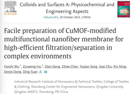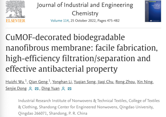 2019级纺织工程专业吴慧芝针对传统的纤维过滤材料(如熔喷纤维、玻璃纤维等)难以同时有效过滤细颗粒物(PM2.5/ PM0.3)和灭活空气中病原体的缺陷,通过改变纳米纤维的组分和结构,构筑出具备出色综合性能的复合纤维膜材料,该研究为应对复杂环境下的空气过滤和油水分离等问题提供一种有效的方法。其中一项成果以“CuMOF-decorated biodegradable nanofibrous membrane: facile fabrication, high-efficiency filtration/separation and effective antibacterial property”为题发表在SCI期刊《Journal of Industrial and Engineering Chemistry》上(DOI:10.1016/j.jiec.2022.07.037, IF=6.760);另一项成果以“Facile preparation of CuMOF-modified multifunctional nanofiber membrane for high-efficient filtration/separation in complex environments”为题发表在SCI期刊《Colloids and Surfaces A: Physicochemical and Engineering Aspects》上(DOI:10.1016/j.jiec.2022.07.037, IF=5.518)。两篇论文的第一作者均为吴慧芝,指导教师和论文通讯作者系袁丁副教授,bevictor伟德官网为第一完成单位。