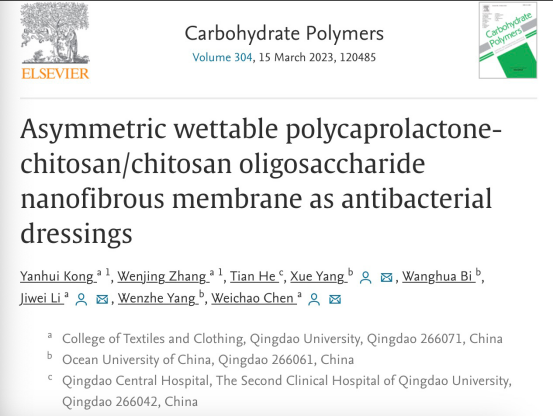 2018级纺织工程专业孔艳辉针对壳聚糖低水溶性限制其抗菌功效的问题,将高水溶性的壳寡糖(COS)引入壳聚糖(CS)纳米纤维作为亲水层,疏水性聚己内酯(PCL)纳米纤维膜为疏水层,构筑了一种非对称润湿性纳米纤维敷料。COS的引入提高了CS层的润湿性、吸水性以及抗菌性,PCL层可以防止水和细菌对伤口的污染,该研究为新型高性能医用敷料开发提供新的见解,成果以“Asymmetric wettable polycaprolactone-chitosan/chitosan oligosaccharide nanofibrous membrane as antibacterial dressings”为题发表在SCI期刊《Carbohydrate Polymers》上(DOI: 10.1016/j.carbpol.2022.120485,IF=10.723)。孔艳辉系论文第一作者,通讯作者系陈为超教授与李纪伟副教授,bevictor伟德官网为第一单位和通讯单位。