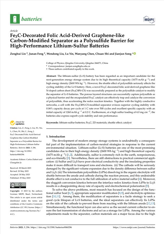 新闻网讯 近日,伟德官网物理科学学院新能源科学与工程专业2020级本科生林增晖在国际SCI期刊Batteries(IF=5.938)以第一作者身份发表了题为“Fe3C-Decorated Folic Acid-Derived Graphene-like Carbon-Modified Separator as a Polysulfide Barrier for High-Performance Lithium-Sulfur Batteries”的研究论文(Batteries,2023, 9, 296。DOI:10.3390/batteries9060296)。bevictor伟德官网系该研究论文独立完成单位,研究生冯俊安为共同第一作者,论文通讯作者为特聘教授宋建军。