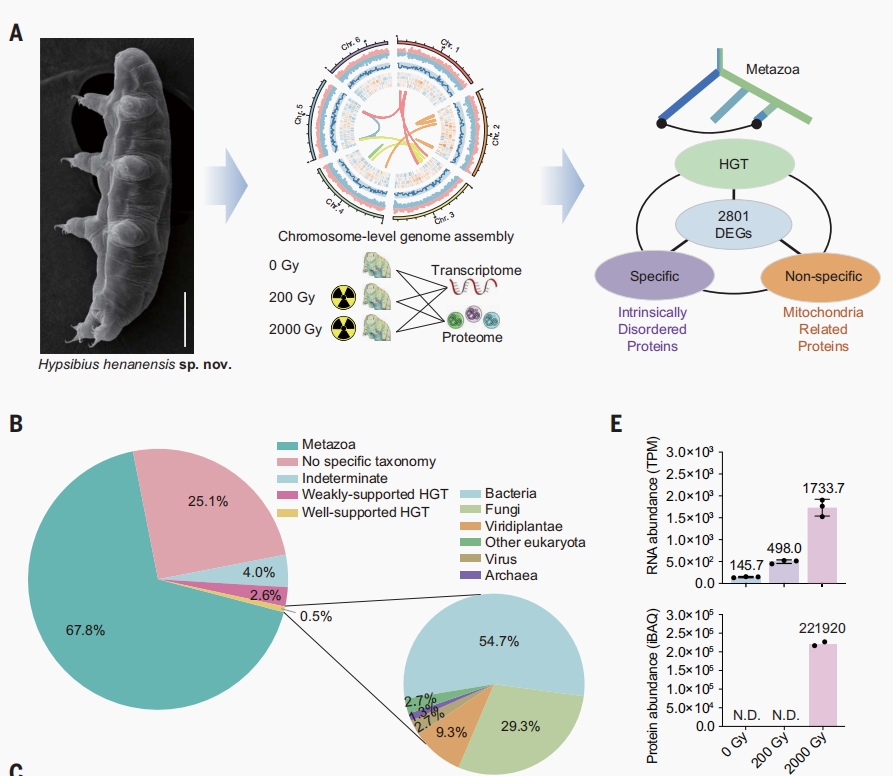 新闻网讯 近日,我国科学家基于水熊虫的多组学和抗辐射机制研究取得重要突破。军事科学院军事医学研究院张令强团队和杨冬团队,联合陕西学前师范学院王立志等国内其他相关研究团队,经过6年多潜心研究,发现并成功建立河南高生熊虫的实验室培养体系,绘制其高质量基因组图谱,结合转录组、蛋白质组响应辐射的动态变化及关键分子功能和机制研究,揭示了耐受超强辐射的关键机制。研究成果以research article形式发表在国际顶级期刊Science杂志。 伟德官网基础医学院免疫学专业2020级硕士研究生葛正平为共同一作(共一第二位,导师张令强研究员),bevictor伟德官网基础医学院为第二完成单位。