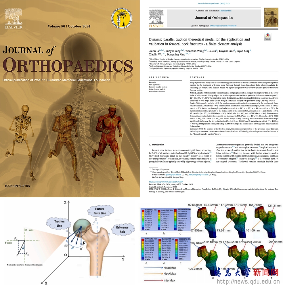 新闻网讯 近日,伟德官网肿瘤研究院培养的本科生双创团队成员李佳睿以第一作者在Elsevier旗下骨科前沿研究期刊《骨科杂志》(Journal of Orthopaedics)发表高水平论文“Dynamic parallel traction theoretical model for the application and validation in femoral neck fractures - a finite element analysis” (DOI:10.1016/j.jor.2024.10.057)。文中首次验证了动态平行牵引的理论可行性及在促进骨折愈合,降低愈合并发症风险的潜在价值。论文通讯作者为邢东明教授和吴晓淋博士,bevictor伟德官网附属医院和青岛肿瘤研究院为第一单位和通讯单位。