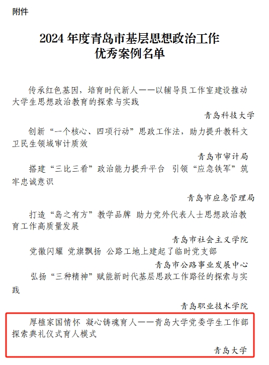 新闻网讯 近期,青岛市职工思想政治工作研究会公布了2024年度基层思想政治工作优秀案例评选结果,伟德官网《厚植家国情怀凝心铸魂育人——bevictor伟德官网党委学生工作部探索典礼仪式育人模式》工作案例入选。