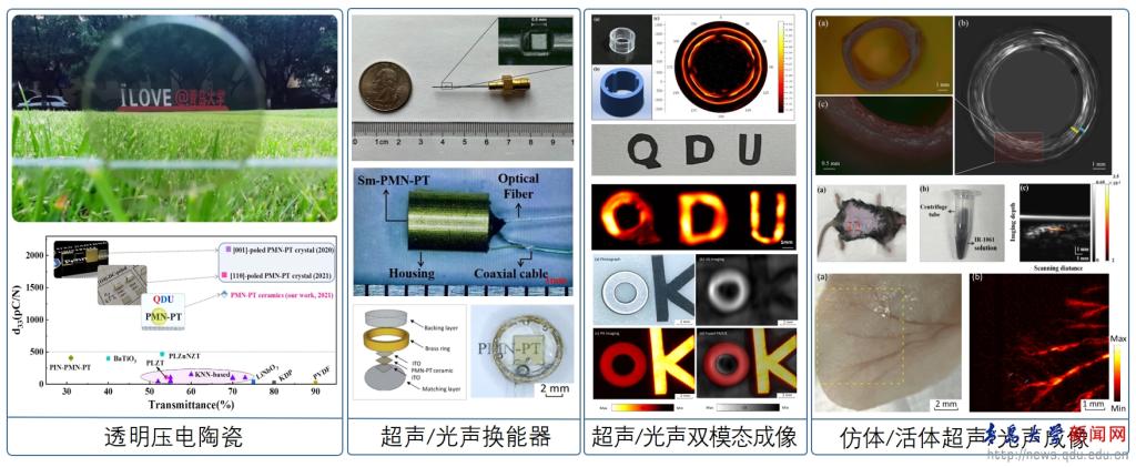近年来,物理科学学院积极推进“医理工”多学科交叉融合,在新一代光声成像技术、太赫兹成像精准医疗、静电纺丝快速止血、医用气体传感器等方面取得系列成果。张永成团队从事透明压电陶瓷及应用研究多年,通过稀土元素掺杂改性和烧结工艺优化,率先制备出压电系数大于1400pC/N、未镀增透膜时近红外光透过率达68%(接近理论极限)的二元PMN-PT透明压电陶瓷(ACS Appl. Mater. Interfaces, 13, 54210−54216(2021);Journal of Alloys and Compounds 1010, 177640(2025))以及压电系数900-1000pC/N、具有高居里点和高温度稳定性的三元PIN-PMN-PT透明压电陶瓷(Appl. Phys. Lett. 125, 242905 (2024);ACS Appl. Mater. Interfaces 15, 7053−7062(2023))。所报道的性能均为该体系的最高值,且远高于其它已报道的铅基和无铅透明压电陶瓷。通过物相结构、显微结构以及铁电畴结构的观察与分析,揭示了其高透明与高压电共存的机理。在此基础上分别与中科院深圳先进技术研究院、上海理工大学合作设计制作了中心频率为16-28MHz的透明光声换能器以及30MHz的高频超声换能器,并基于该体系换能器首次实现了对仿体和活体进行了光声/超声多模态成像。如猪动脉血管的超声成像(Ultrasonic Imaging, 46, 312-319(2024))、小鼠体内分子探针的超声/光声成像(Nano Energy 132,110390 (2024)),活体小鼠耳朵的皮下微血流的光声成像(Journal of Materiomics,100932(2024))等。结果表明基于高性能透明压电陶瓷设计的超声/光声换能器的带宽和成像效果得到明显提升,未来有望应用于医学成像和诊断,为人民生命健康保驾护航。