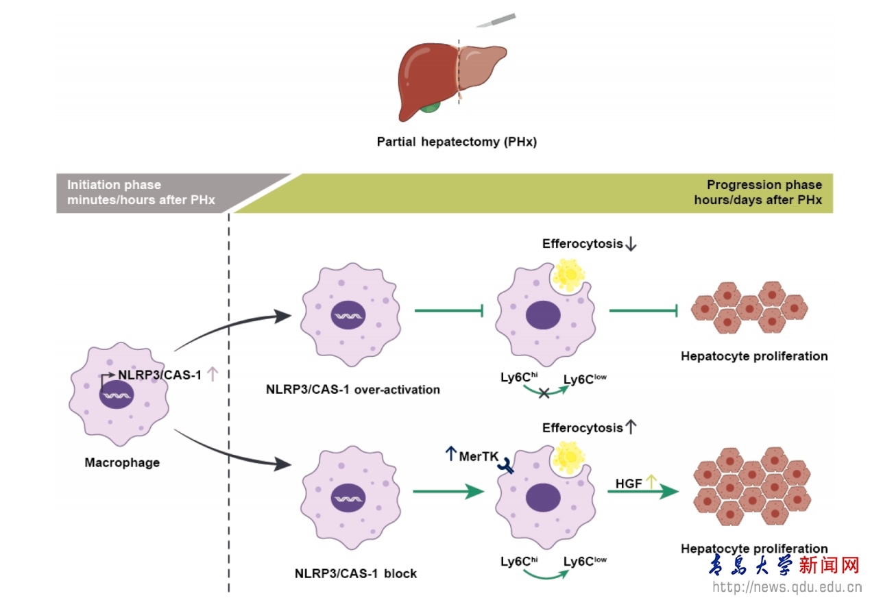 新闻网讯 近日,基础医学院狄国虎、陈鹏教授课题组团队在Science子刊ScienceAdvances杂志在线发表了题为“NLRP3 Inflammasome Constrains Liver Regeneration Through Impairing MerTK Mediated Macrophage Efferocytosis”的研究论文(IF=11.7,DOI: 10.1126/sciadv.adq5786)。该研究揭示了巨噬细胞NLRP3炎症小体在限制肝脏再生中的重要作用,并为靶向NLRP3提供了新的治疗策略。2020级特种医学硕士研究生韦素素(现就职于齐鲁中科现代微生物技术研究院)、bevictor伟德官网附属医院器官移植中心副主任医师关鸽、2021级特种医学硕士研究生栾晓瑜(现博士就读于中国科学院遗传与发育生物学研究所)、2021级特种医学博士研究生于超群为共同第一作者。基础医学院狄国虎教授、陈鹏教授为共同通讯作者。基础医学院为第一完成单位和唯一通讯单位。该研究受到科技部重点研发计划、山东省自然科学基金、山东省高校青创团队计划、青岛市科技惠民师范专项和bevictor伟德官网“医学+”课题等项目的资助。