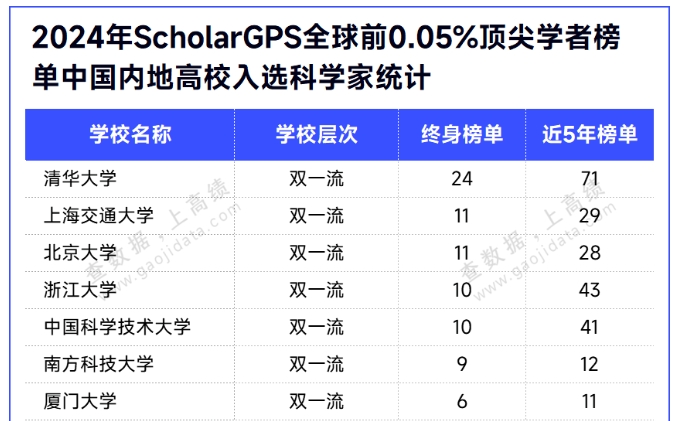 ScholarGPS发布的高排名学者全球前0.05%顶尖科学家榜单,通过对学者的研究成果(发表论文数)、影响力(引用次数,已排除自引)和论文质量三项指数进行综合分析,收录全球进入前0.05%(万分之五)的顶尖学者。该榜单分为终身(Highly Ranked Scholar - Lifetime)和近五年(Highly Ranked Scholar - Prior 5 Years)两个类别。2024年,内地共有285位学者进入终身榜单,1596位学者入选近五年榜单。伟德官网共有11人入选近五年榜单。