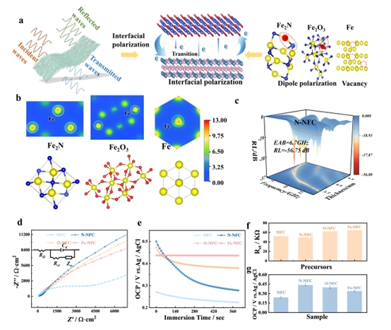 结果表明,氮和氧等杂原子在增强材料的极化效应中起着关键作用。这些杂原子引入了额外的缺陷位点并诱导了局部结构畸变,从而产生了额外的极化中心,显著改善了极化损耗和EMW吸收性能。得益于独特的杂原子梯度分布与多尺度异质结构设计,Fe₂N@Ni₃Fe/CNF复合材料展现出卓越的吸波性能,材料同时展现优异的耐腐蚀特性,根据电化学阻抗测试显示电荷转移电阻最低,基于DFT模拟结果,Fe2N、Fe2O3和Fe在吸波材料中通过多重损耗机制协同优化阻抗匹配,有效增强电磁波吸收性能。这项工作通过建立杂原子-界面构效关系模型,为新型电磁吸收材料的原子尺度工程化设计提供了理论依据。
