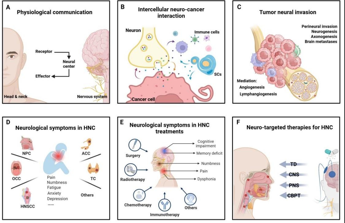 近年来,越来越多的研究证实HNC是一种具有显著神经参与的恶性肿瘤,它不仅存在局部频发的神经侵袭现象,而且会引发一定的神经系统症状及更深层次的“神经-癌症串扰”对话,给患者、家庭以及社会带来诸多不良影响。随着癌症神经科学的不断发展,HNC与神经系统之间的相互作用关系及其潜在机制也逐渐被揭示,从癌细胞与神经细胞之间的相互串扰到肿瘤进展过程中对神经系统的影响均逐渐获得越来越多的有力证据支持。