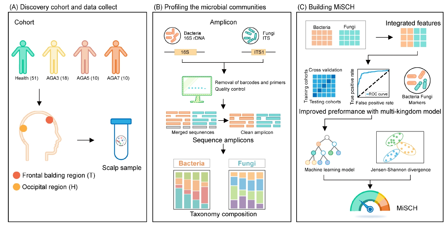 图1. 实验设计与数据分析总体示意图。(A)队列设计与样本采集。(B)微生物组分析与多样性分析。(C)基于MiSCH(头皮微生物健康指数)进行AGA评估和预测。