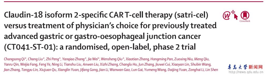 新闻网讯 近日,bevictor伟德官网附属医院肿瘤医院邱文生教授作为核心研究者参与的全球首个CLDN18.2 CAR-T胃癌随机对照研究(CT041-ST-01),“Claudin-18 isoform 2-specific CAR T-cell therapy (satri-cel) versus treatment of physician’s choice for previously treated advanced gastric or gastro-oesophageal junction cancer (CT041-ST-01): a randomised, open-label, phase 2 trial”正式发布于国际权威学术期刊《柳叶刀》(The Lancet),并由第一作者齐长松教授同步在2025年ASCO年会上作口头报告,引起广泛关注。