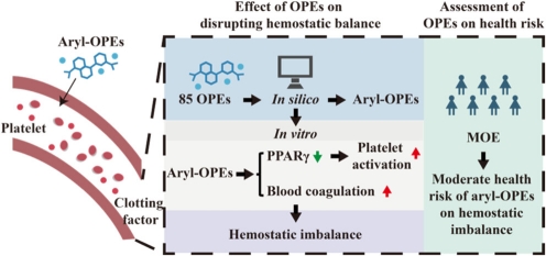 阻燃剂在电子产品和建筑材料中承担着关键的防火功能。有机磷酸酯(OPEs)因其高效的阻燃性能、相对环保的特性以及成本优势,在全球范围内被大量应用,并逐渐替代传统的溴化阻燃剂。特别是芳基有机磷酸酯(aryl-OPEs),如双酚A双(二苯基磷酸酯)(BDP)和磷酸甲苯二苯酯(CDP)等含苯环结构的物质,因其优异的热稳定性,成为塑料、家具及电子设备中不可或缺的添加剂。然而,这些物质在使用过程中会持续释放到环境中,目前已在全球范围内的空气、灰尘、食物链乃至人体血液中被广泛检出。研究表明,人群血液中BDP的浓度可高达38.2 ng/mL,CDP也达到15.0 ng/mL。尽管OPEs的神经发育毒性和生殖毒性已有所报道,但它们对凝血系统的具体破坏机制仍是一块空白。凝血功能失衡直接关联血栓形成、心肌梗死等严重心血管疾病,因此,阐明aryl-OPEs的血液毒性机制具有重大的公共卫生意义和紧迫性。