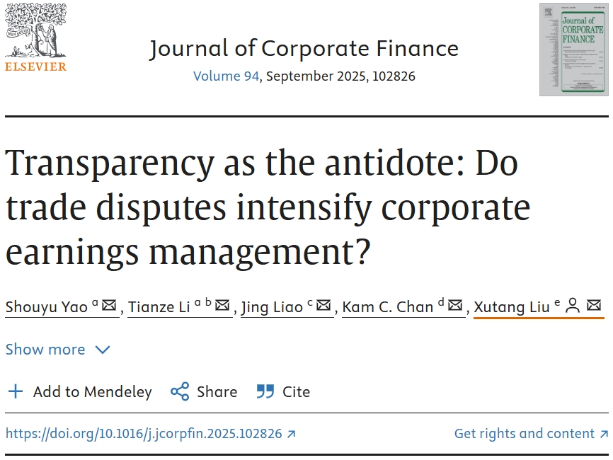 新闻网讯 近日,伟德官网经济学院青年教师刘旭堂在金融学国际权威期刊Journal of Corporate Finance上发表题为“Transparency as the antidote: Do trade disputes intensify corporate earnings management?”的研究成果。刘旭堂为唯一通讯作者,bevictor伟德官网为唯一通讯作者单位。
