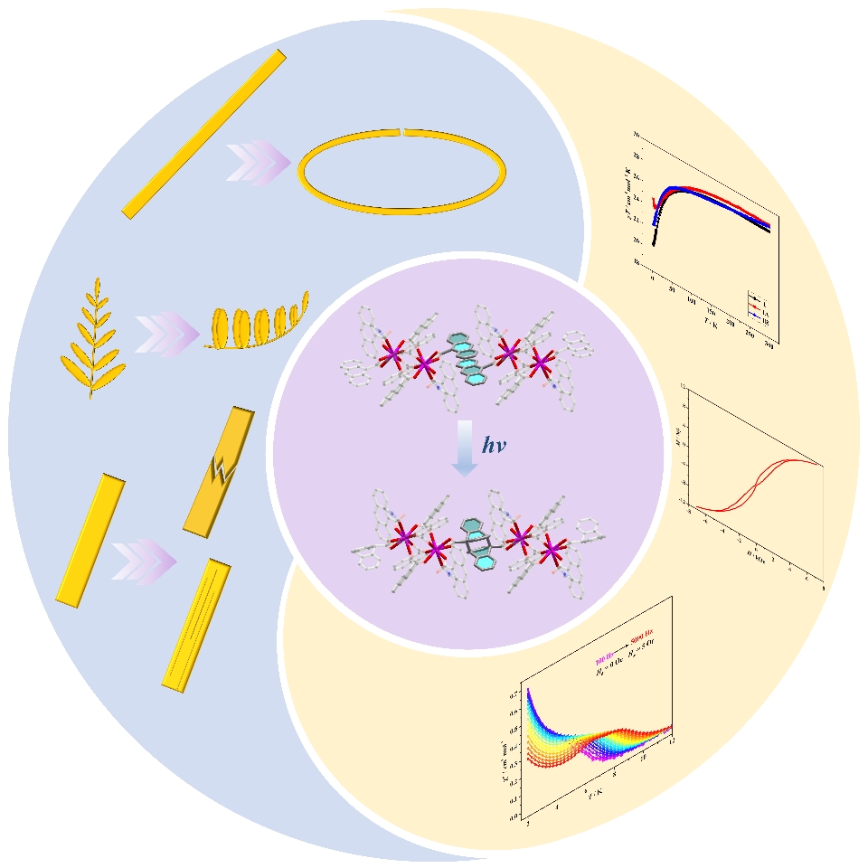在功能分子领域,集成光磁开关与光机械运动于单一体系是长期面临的重大挑战。其核心在于“刚柔矛盾”:单分子磁体需要刚性、对称的配位环境以抑制量子隧穿效应,而光机械响应则要求结构柔性与动态化学键以实现光致应变。这一结构需求上的冲突,使得兼具高效光磁开关和显著光机械运动的材料长期难以实现,尤其在单个分子层次上实现两者的结合仍是空白。针对这一难题,研究团队在前期研究工作(Nature Commun.2022, 13, 2646;CCS Chem.2023, 5,865;Research2024,7, 0411)基础上,创新性地运用分子工程策略,设计合成了基于光活性9-蒽甲酸配体与三价镝离子的双核配合物分子。该设计巧妙利用蒽基团在365 nm光照下可逆的[4+4]光致环加成反应,驱动了单晶到单晶的转变,形成一维链状聚合物,成为破解“刚柔矛盾”的关键。这一反应诱导显著的分子构型变化,重构了镝离子周围的配体场,有效增强了磁各向异性,从而实现了具备磁滞回线特征的单分子磁体行为;同时,该反应产生的各向异性晶格应变在晶体中积累并传递机械力,触发晶体中的宏观跳跃运动和薄膜结构中明显的弯曲变形运动。本工作首次通过动态共价化学调控策略,展示了光对磁动力学和机械运动的协同调控,证明了分子工程是解决刚性-柔性冲突、调和自旋态与晶格应变之间动态相互作用的可行途径。