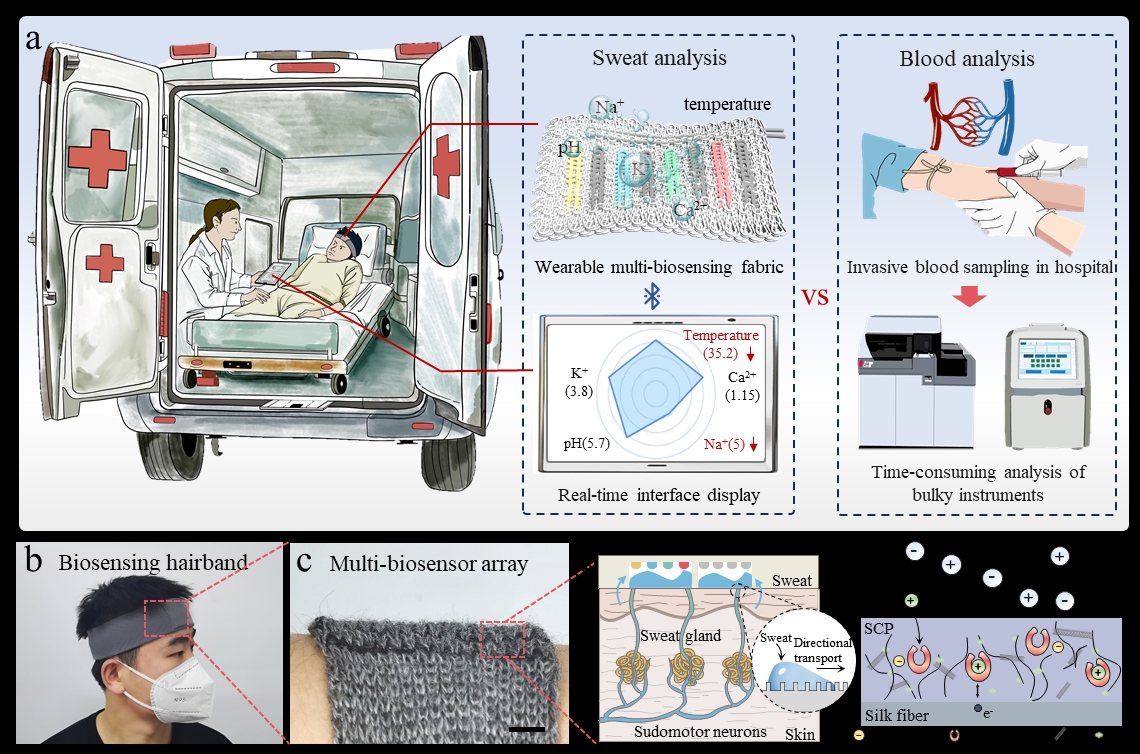 研究利用同轴湿纺丝技术开发了一种可编织的多模态生物传感阵列,用于实时、多路检测汗液标志物(pH、Na+、K+和Ca2+)和体温。制得的多模态传感纱线灵敏度高、稳定性强,同时具有良好的生物相容性和可降解性。具有多孔结构的传感纱线显示出比传统涂层纱线大200倍的表面积,从而促进定向汗水输送。集成式多模态生物传感发带包含信号记录、处理和无线传输组件,能够实时跟踪人体生理动态。这一创新设计具有用于远程医疗监测和紧急健康评估的潜力,为个性化医疗监测提供了新思路,使紧急情况下的早期诊断成为可能。