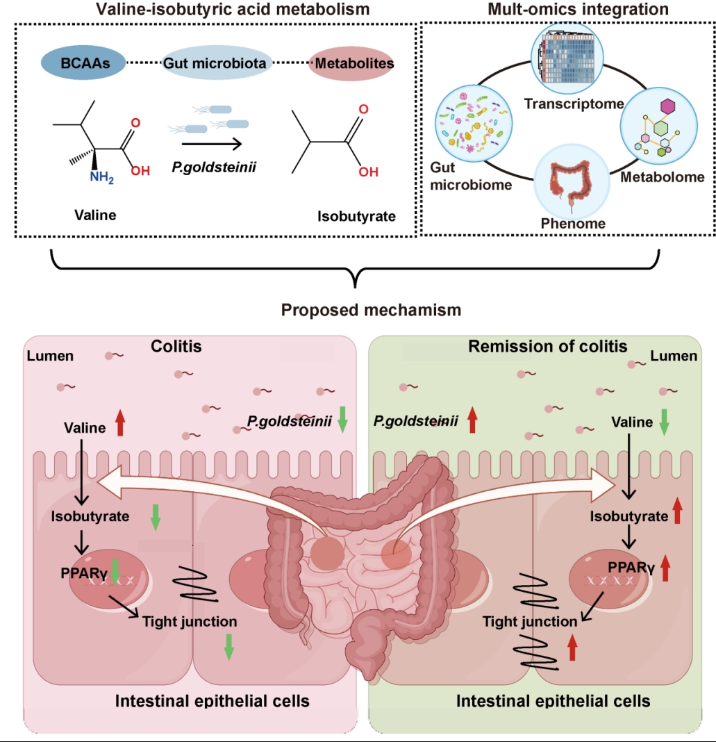 抗生素组合作为治疗难治性溃疡性结肠炎的有效手段,往往会导致肠道微生物群失调。该研究利用小鼠结肠炎模型发现,果胶寡糖能够协同增强抗生素的疗效,同时恢复肠道微生物平衡,并选择性富集P. goldsteinii菌株。课题组利用P. goldsteinii单一菌株灌胃处理显著缓解了肠炎症状,多组学分析结合P. goldsteinii菌株异丁酸合成基因敲除株处理发现其作用机制依赖于缬氨酸-异丁酸盐代谢途径。利用细胞实验和动物模型进一步证实了异丁酸通过激活过氧化物酶体增殖物激活受体γ(PPARγ)途径来增强肠道屏障功能,为后续溃疡性结肠炎的肠道微生态干预治疗提供了证据。