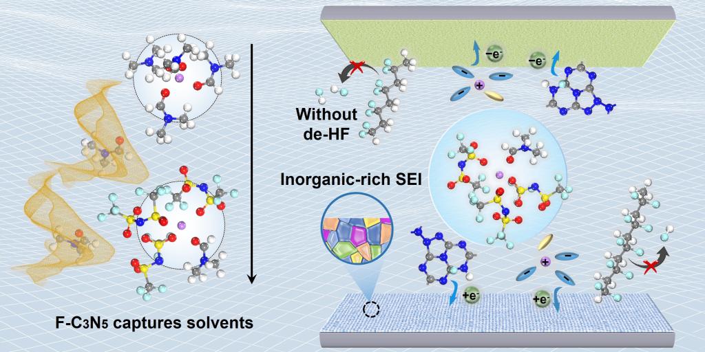 新闻网讯 近日,物理科学学院郭向欣教授固态电池团队在聚偏二氟乙烯基固态电解质中的溶剂化结构调控领域取得重要研究进展。相关原创性研究成果以“Fluorinated carbon nitrides assisted solvation-regulation engineering toward polyvinylidene fluoride-based electrolytes for long-lifespan solid-state lithium batteries”为题,发表在国际顶级学术期刊Energy & Environmental Science(影响因子30.8)上。论文第一作者为常晓彤(2023级物理学硕士),通讯作者为郭向欣教授、毕志杰副教授和浙江大学范修林教授。