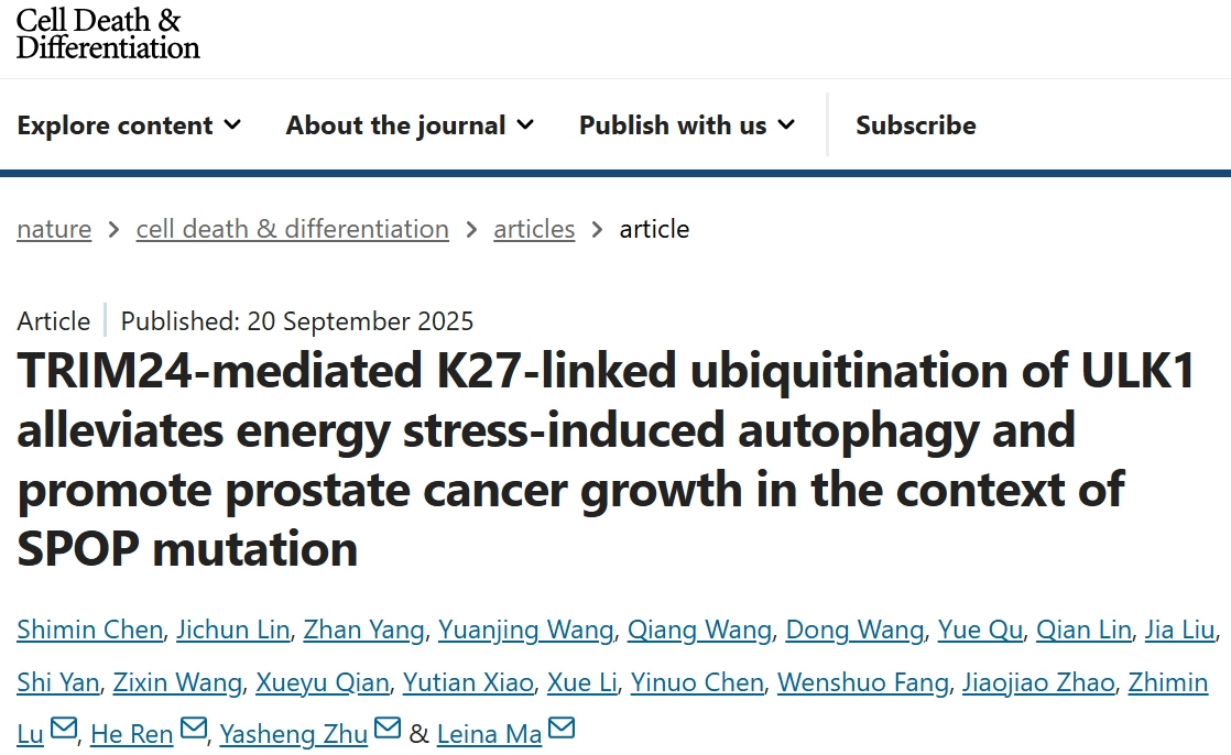 新闻网讯 近日,肿瘤精准医学研究院马蕾娜教授团队在国际权威期刊《自然—细胞死亡分化》(Cell Death & Differentiation,Nature-Index自然指数杂志,影响因子15.4)上在线发表题为“TRIM24-mediated K27-linked ubiquitination of ULK1 alleviates energy stress-induced autophagy and promote prostate cancer growth in the context of SPOP mutation”的研究论文。基础医学院2022级硕士研究生陈诗敏为该文的共同第一作者。