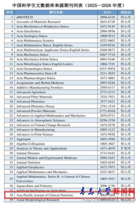 新闻网讯 近日,由伟德官网主办的《亚太临床营养学杂志(英文)》(APJCN)成功入选2025-2026年度中国科学引文数据库(CSCD)核心库。这是该期刊继被SCI、Scopus、Medline等国际权威数据库收录后,在学术影响力方面取得的又一重要突破,标志着其学术质量与学科贡献获得了国内权威评价体系的高度认可。