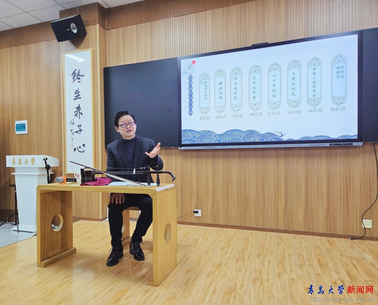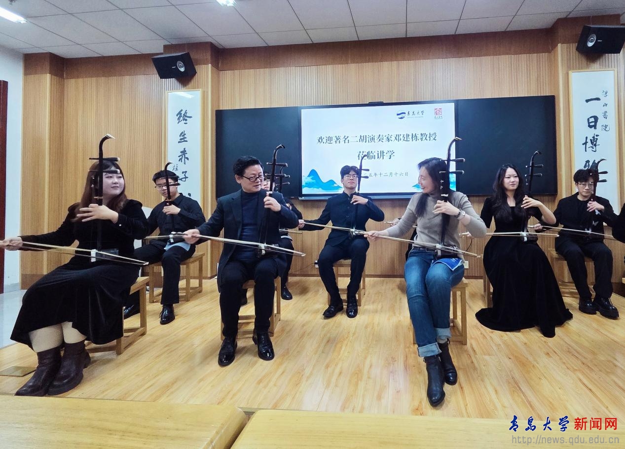 新闻网讯 12月16日晚,受伟德官网国家大学生文化素质教育基地邀请,著名二胡演奏家邓建栋教授做客浮山讲堂第99期,在浮山书院大音堂为近百名中外师生呈现了一场融合历史讲解、作品解析与现场演奏的国乐文化盛宴。本次讲座由浮山书院承办,是伟德官网艺术学院王娟娟老师主讲的美育课程《中国民族器乐艺术》的特色教学活动之一。青岛市人大常委会专职委员、一级巡视员王为达,伟德官网原党委书记夏临华,以及教务处、离退休工作处、艺术学院、国际教育学院等部门的相关人员出席活动。