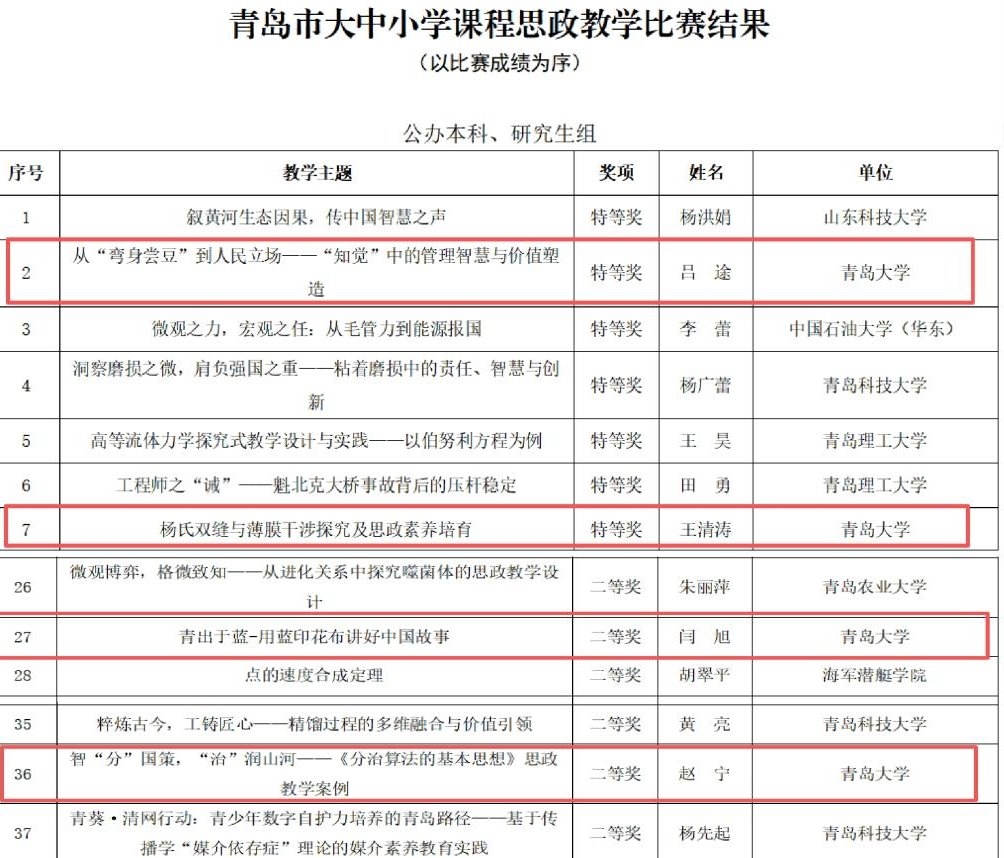 新闻网讯 近日,青岛市委教育工委印发《关于公布青岛市大中小学课程思政教学比赛结果的通知》,伟德官网有4名教师获奖,其中商学院吕途《从“弯身尝豆”到人民立场——“知觉”中的管理智慧与价值塑造》、物理科学学院王清涛《杨氏双缝与薄膜干涉探究及思政素养培育》获特等奖,纺织服装学院闫旭《青出于蓝-用蓝印花布讲好中国故事》、计算机科学技术学院赵宁《智“分”国策,“治”润山河——《分治算法的基本思想》思政教学案例》获二等奖。