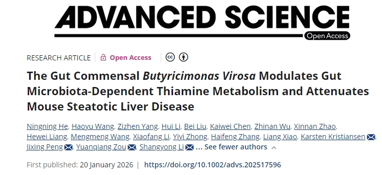 代谢功能障碍相关脂肪性肝病(MASLD)困扰全球约30%人群,可进展为肝纤维化、肝癌等重症,其发病与脂质代谢紊乱、肠道菌群失衡、硫胺素(维生素B1)缺乏密切相关。研究发现,一株新型肠道丁酸单胞菌(B. virosa)可在结肠定植并高效合成硫胺素,经门静脉转运至肝脏后提升焦磷酸硫胺素及pBCKDHA活性,进而加速支链氨基酸降解,抑制高脂饮食小鼠的MASLD进展;进一步研究发现,在硫胺素缺乏饮食条件下补充该菌株也能显著提升肠道单磷酸硫胺素含量,缓解小鼠MASLD症状。