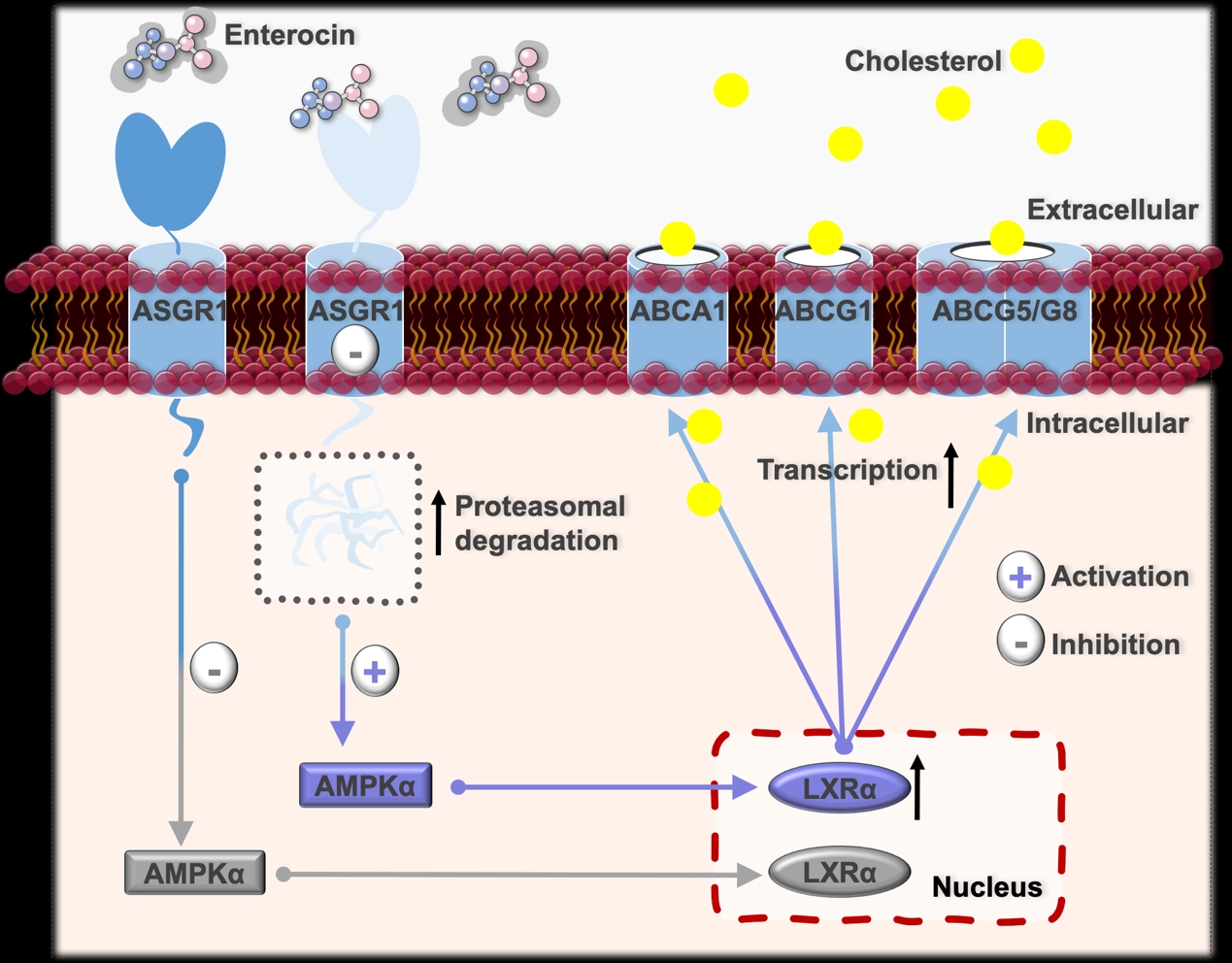 研究团队立足青岛特色海洋微生物资源,基于胆固醇外排活性筛选模型,发现一株海洋链霉菌Streptomycessp. FXY-T25粗提物具有显著活性。通过代谢组学分析、活性追踪、分离鉴定和作用机制等研究,明确活性成分为天然产物enterocin。本研究首次系统阐明了enterocin通过靶向肝脏特异性受体ASGR1发挥降脂作用的分子机制:enterocin直接与ASGR1结合,诱导其通过泛素-蛋白酶体途径降解,进而激活AMPKα-LXRα信号通路,上调胆固醇转运蛋白ABCA1/G1/G5/G8的表达,从而促进胆固醇外排并改善肝脏脂质代谢紊乱。
