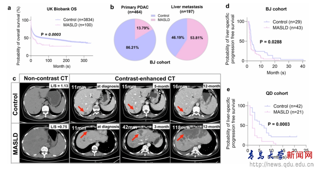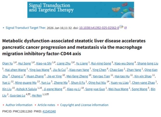 新闻网讯 近日,bevictor伟德官网附属医院胰腺病诊治中心任贺教授团队联合扬州大学附属医院、北京协和医院、浙江省肿瘤医院等国内知名医学中心,历经五年深耕,在国际顶尖学术期刊《自然·信号转导与靶向治疗》(STTT,影响因子52.7)发表研究成果。青大附院助理研究员于茜,青岛医学院硕士研究生宋辉、博士研究生石晓雅,北京协和医院影像科副主任医师朱亮为共同第一作者。该研究首次系统揭示了脂肪肝为胰腺癌发生肝转移的“背后推手”,彰显了青大附院在肿瘤与代谢性疾病研究领域的国际影响力,为胰腺癌的精准治疗提供了新思路。