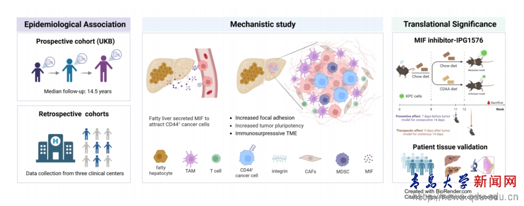 过去人们往往觉得脂肪肝只是吃出来的“富贵病”,没有引起普遍重视。任贺教授团队在临床中敏锐地发现,合并有脂肪肝的胰腺癌患者,似乎更容易出现肝转移。为了证实这个猜想,研究团队展开了一场跨越国界、覆盖数十万人的临床研究。研究团队通过UK Biobank超大规模人群数据进行分析并通过动物模型和分子实验,揪出了潜伏在肝脏里的“内鬼”——MIF-CD44信号轴。同时,团队应用了名为IPG1576的MIF小分子抑制剂进行干预实验,结果令人振奋:无论是预防性用药,还是在肿瘤发生后进行治疗,该药物均能显著减轻脂肪肝诱发的肝转移。更重要的是,研究团队在青大附院接受手术的患者病理切片中,也验证了这一机制。这意味着未来研究人员或许可以通过干预脂肪肝、阻断这个特定通路,精准预测甚至阻断胰腺癌的肝转移。