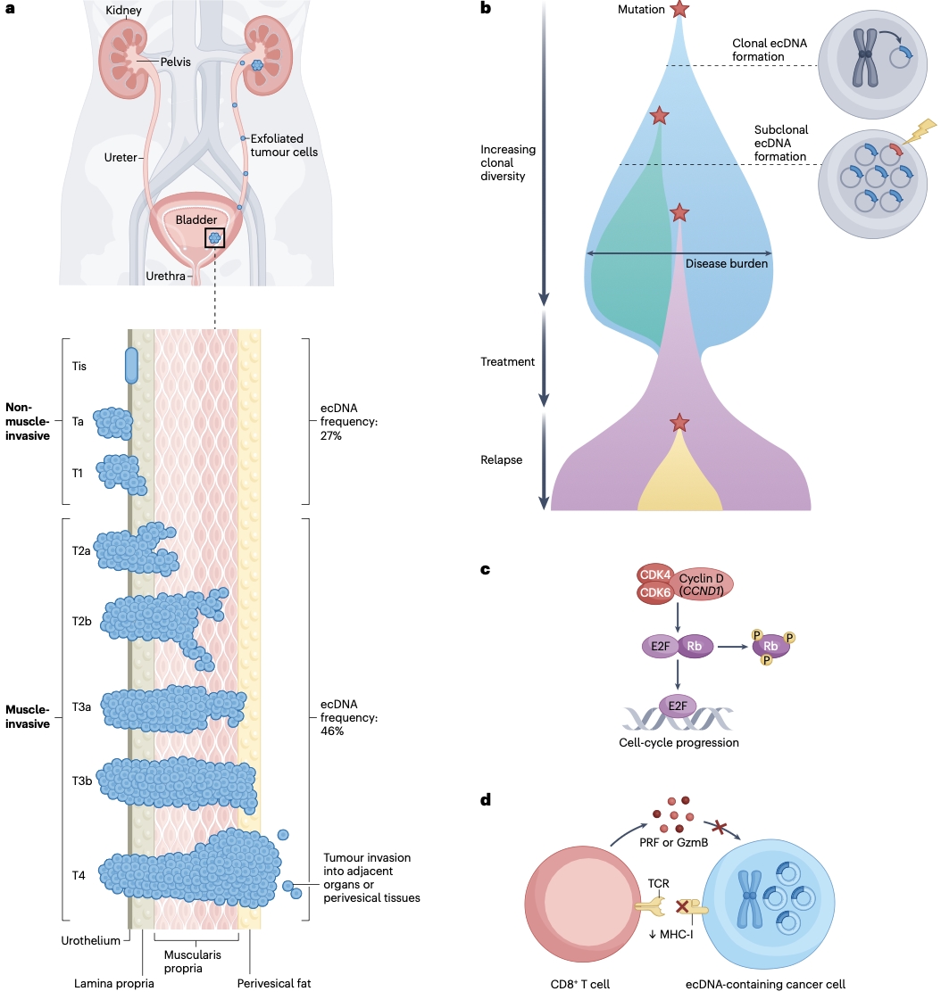 尿路上皮癌长期以来以高异质性和高复发率著称,其分子机制复杂且尚未完全阐明。近年来,ecDNA作为一种非染色体来源的基因扩增形式,逐渐成为肿瘤研究的热点。研究指出,在尿路上皮癌中,ecDNA存在于约36%的患者中,且在部分癌前病变阶段已可检测到,提示其可能在肿瘤早期发生过程中发挥关键作用。与传统染色体扩增不同,ecDNA具有独特的生物学特性。由于缺乏着丝粒,ecDNA在细胞分裂过程中呈随机分配,从而导致不同肿瘤细胞间致癌基因拷贝数显著差异。这种非孟德尔遗传模式使肿瘤能够快速产生异质性,并在治疗压力下实现快速进化,促进耐药克隆的形成和扩增。在功能层面,ecDNA不仅能够高效扩增致癌基因(如CCND1、ERBB2和MDM2),还可以通过重塑染色质结构和增强子互作,显著增强基因转录活性。此外,ecDNA还与免疫逃逸相关,其存在往往伴随着抗原呈递能力下降和免疫抑制微环境的形成。在临床转化方面,ecDNA展现出重要应用潜力。研究表明,ecDNA可通过尿液或血液进行无创检测,有望用于肿瘤早筛及动态监测。同时,结合数字病理和人工智能方法,有望在常规H&E切片中推断ecDNA状态,为临床提供更加便捷的检测手段。尽管ecDNA研究前景广阔,但其临床应用仍面临诸多挑战,包括检测方法标准化不足、形成机制尚不完全清楚以及缺乏针对ecDNA的临床研究。未来,随着多组学整合和空间技术的发展,ecDNA有望成为连接肿瘤进化机制与临床决策的重要桥梁。