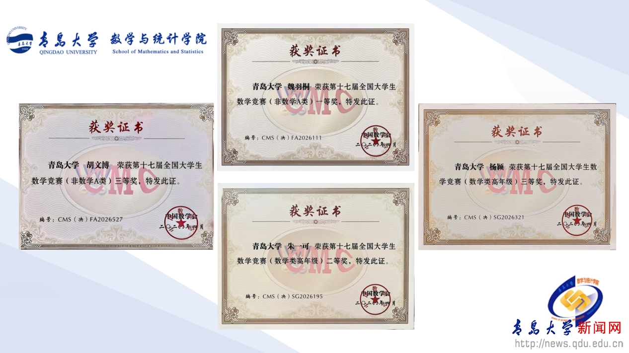 新闻网讯 4月18日至19日,第十七届全国大学生数学竞赛决赛在四川大学成功举办。伟德官网数学与统计学院精心组织参赛,青大学子凭借扎实的专业功底在激烈角逐中再创佳绩,斩获国家一等奖1项(非数学A类)、国家二等奖1项(数学类高年级组)、国家三等奖2项(数学类高年级组和非数学A类),创下伟德官网近五年参赛最好成绩。