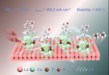 大规模电化学CO2甲烷化是实现碳中和极具前景的途径之一。构建高效且稳定的催化位点对于实现CO2向CH4的转化至关重要。在此,我们设计了一种负载于氧化镧(La2O3)并经己硫醇(HT)分子功能化的含氧铜团簇催化剂(HT@O-Cuc/La2O3),该催化剂实现了77.8%的甲烷法拉第效率(FECH4)和389.2 mA cm-2的分电流密度,并在长达250小时的运行过程中表现出优异的稳定性。硫醇配体通过S原子配位修饰于O-Cuc与La2O3的界面,促进了La与Cu位点之间的电子转移,并建立起一个稳定的电子补充通道,从而在电催化过程中持续稳定低配位的Cuδ+(0.4 < δ < 0.5)活性态。机理研究表明,配体修饰优化了Cu位点对*CO的吸附,并引导*CHO的加氢路径向*CH2OH转变,电子通道效应增强了Cu-C键能,有利于*OH的解吸。同时,La介导的水活化为反应提供了大量质子,推动了*CH2–*CH3–*CH4的定向氢化过程,从而实现了高选择性的CH4生成。